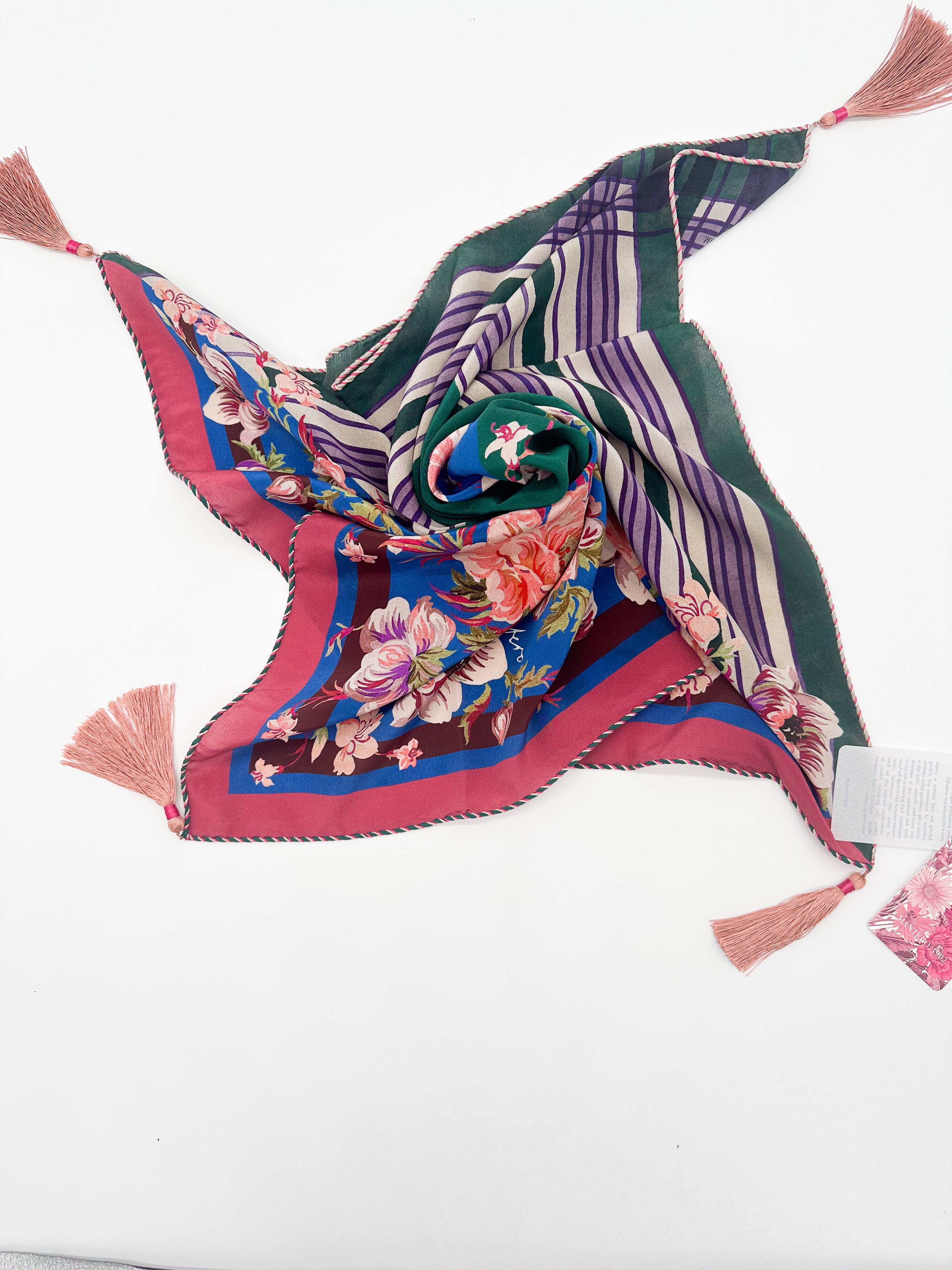 A silk scarf is perfect for wearing around the neck, as a turban, or as an accessory on a bag.